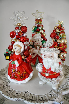 This sweet girl (and the Santa) is a 1950s Napco.  She wears angel's wings and is carrying an armful of gifts in her mitten-ed and muff-ed hands.  Around her Christmas hat and coat is that wonderful spaghetti trim so adored by collectors.  And notice her ruffled dress?  It's a gorgeous shade of turquoise blue.